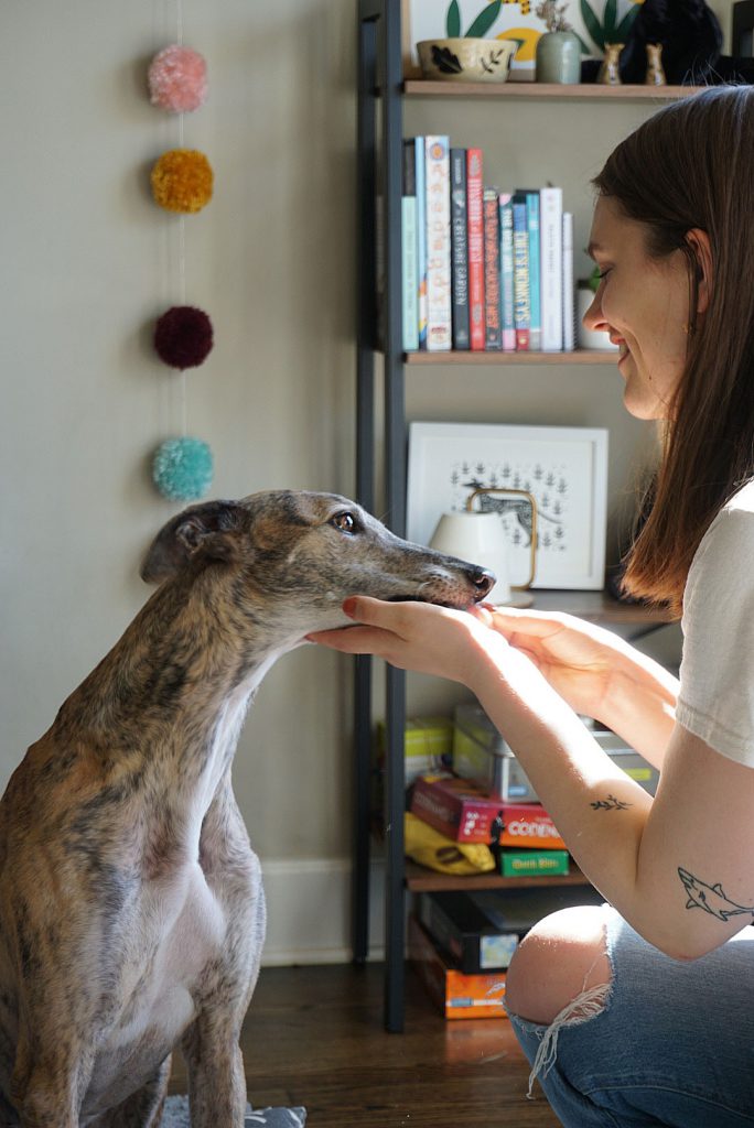 Now that I was feeling more comfortable with the camera settings, I thought I'd try to get over my inability to take a normal looking photo of myself. I set up my tripod in the sunniest corner of my apartment, lured Greer off the couch with treats, and tried to get the self-timer working.